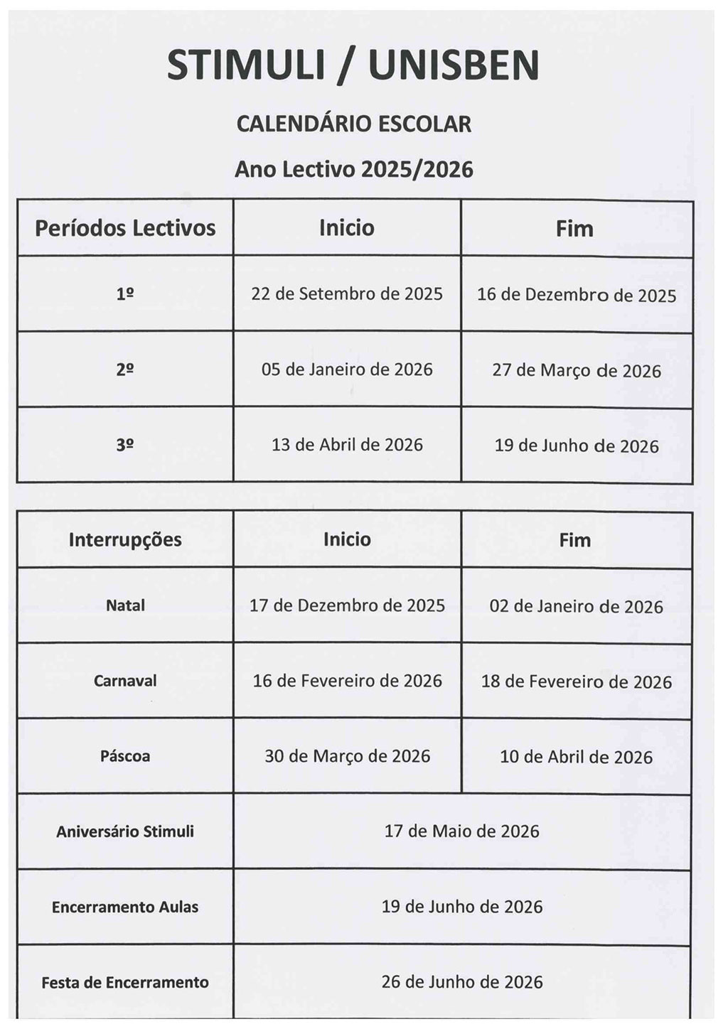 CALENDÁRIO ESCOLAR 2025/2026